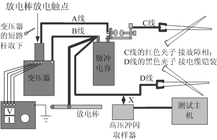 步驟6:用高壓沖閃線連接主機(jī)信號接口和高壓沖閃取樣器。高壓沖閃取樣器要盡量靠近上圖中的“D”連接線,這樣更容易接收故障信號。