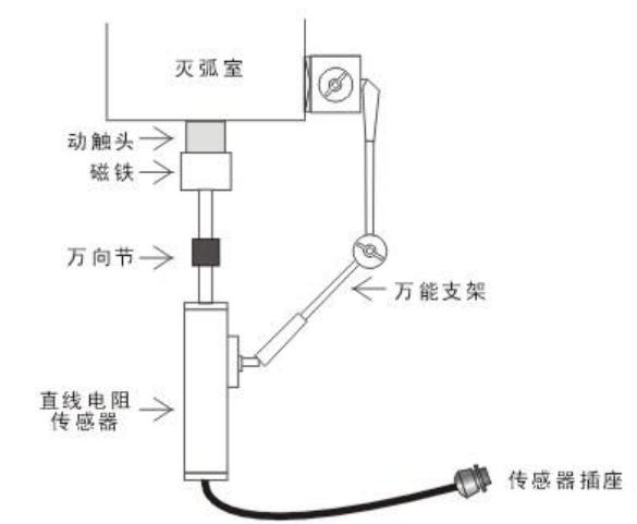 200mm、300mm用于SF6開(kāi)關(guān)行程,速度的測(cè)量,此兩種傳感器為非標(biāo)準(zhǔn)配置。以某型號(hào)真空開(kāi)關(guān)為例,如下圖。直線(xiàn)電阻傳感器在安裝時(shí),要保證傳感器運(yùn)動(dòng)軸能夠直線(xiàn)運(yùn)動(dòng),用磁性萬(wàn)能支架固定好傳感器。對(duì)于SF6開(kāi)關(guān)、油開(kāi)關(guān),方法類(lèi)似。