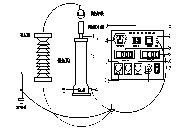 10.升壓至所需電壓或電流。升壓速度以每秒3—5kV試驗電壓為宜。對于大電容試品升壓時還需監(jiān)視電流表充電電流不超過試驗器的最大充電電流。對小電容試品如氧化鋅避雷器、磁吹避雷器等先升至所需電壓(電流)的95%,再緩慢仔細升至所需的電壓(電流)。然后從數(shù)顯表上讀出電壓(電流)值。如需對氧化鋅避雷器進行0.75UDC—1mA測量時,先升至UDC1mA電壓值,然后按下黃色按鈕,此時電壓即降至原來的75%,并保持此狀態(tài)。此時可讀取電流。測量完畢后,調(diào)壓電位器逆時針回到零,按下綠色按鈕。需再次升壓時按紅色按鈕即可。