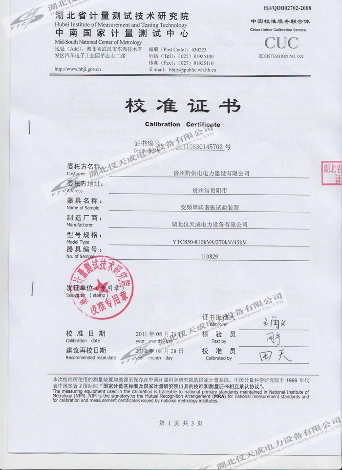 轉載:"YTC850-810kVA/270kV/45kV變頻串聯(lián)諧振試驗裝置的資質證書" 請注明來源于儀天成電力。 更多技術問題請致電儀天成電力客戶服務:027-87876585,技術部專線:027-87876585,在線客服:719388481