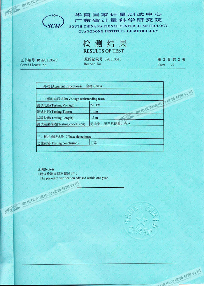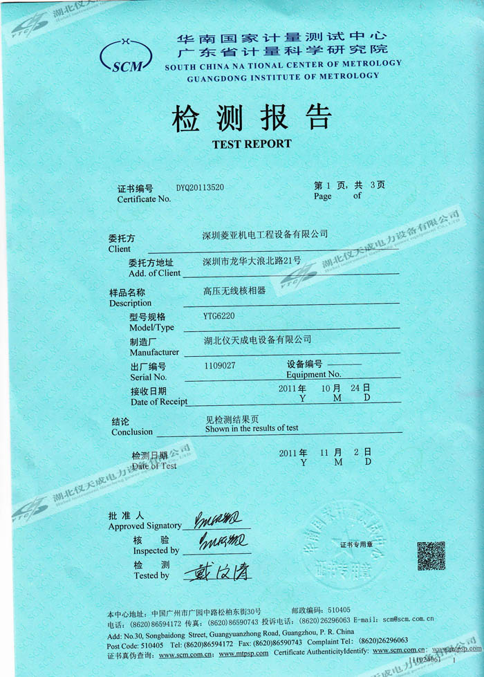 轉(zhuǎn)載:"YTC6220高壓無線核相器的資質(zhì)證書" 請注明來源于儀天成電力。 更多技術(shù)問題請致電儀天成電力客戶服務(wù):027-87876585,技術(shù)部專線:027-87876585,在線客服:719388481