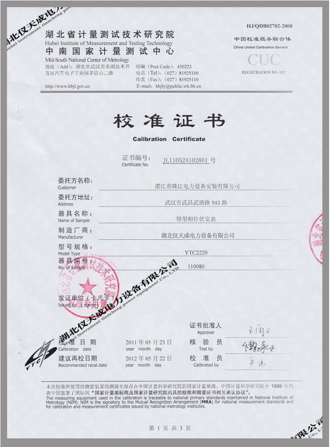 YTC2220數(shù)字雙鉗相位伏安表鑒定證書