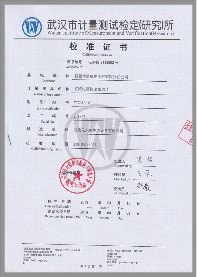 轉(zhuǎn)載:"YTC316-10直流電阻測(cè)試儀鑒定證書" 請(qǐng)注明來(lái)源于儀天成電力。 更多技術(shù)問(wèn)題請(qǐng)致電儀天成電力客戶服務(wù):027-87876585,技術(shù)部專線:027-87876585,在線客服: